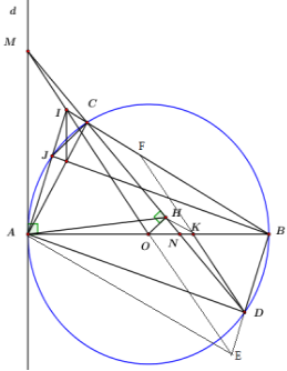 Cho đường tròn tâm O, đường kính AB và d là một tiếp tuyến của đường tròn (O) tại điểm A. Trên đường thẳng d lấy điểm M (khác A) và trên đoạn OB lấy điểm N (khác O và B). Đường thẳng MN cắt đường tròn (O) tại hai điểm C và D sao cho C nằm giữa M và D. Gọi H là trung điểm của đoạn thẳng CD.