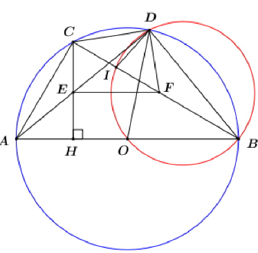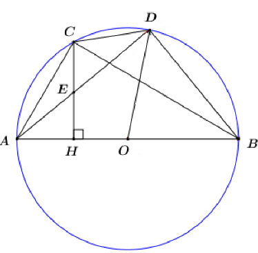 Cho tam giác ABC nội tiếp trong đường tròn tâm O đường kính AB. Trên cung nhỏ BC của đường tròn (O) lấy điểm D (không trùng với B và C). Gọi H là chân đường vuông góc kẻ từ C đến AB (H ∈ AB) và E là giao điểm của CH với AD.