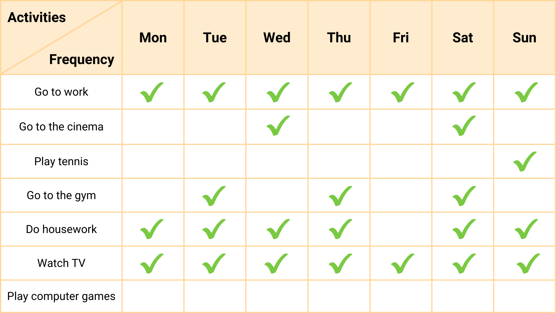I go to the gym, about 3 times a week. I do housework, such as cleaning the house or ironing the clothes. In the evening, I watch my favourite TV programmes but I play computer games. Every year I go on holiday to Spain and Portugal in June or July because I love the hot weather.