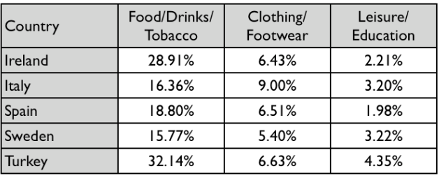 The table below gives information on consumer spending on different items in five different countries in 2002.