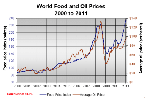 The graph below shows changes in global food and oil prices between 2000 and 2011.