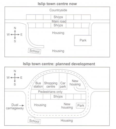 The maps below show the centre of a small town called Islip as it is now, and plans for its development.