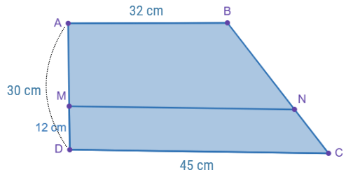Cho hình thang ABCD có góc A và góc D vuông, đáy nhỏ AB = 32 cm, đáy lớn CD = 45 cm, cạnh AD = 30 cm. Trên cạnh AD lấy điểm M sao cho DM = 12 cm. Từ M kẻ đường thẳng song song với DC và cắt BC tại N. Tính diện tích hình thang ABNM.