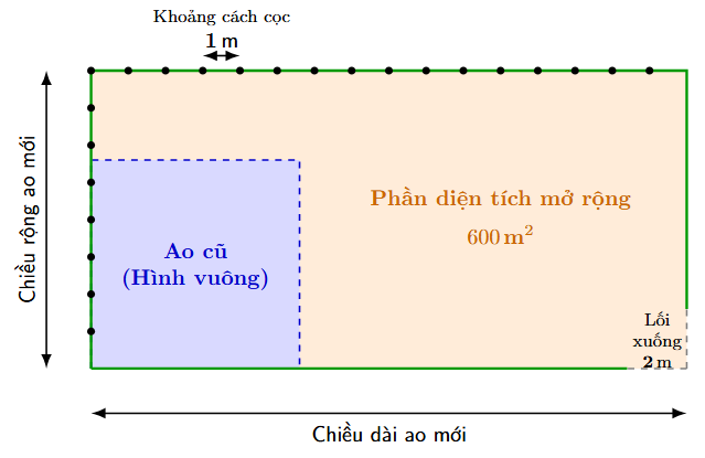 lần ao cũ. Hỏi phải dùng bao nhiêu chiếc cọc để đủ rào xung quanh ao mới? Biết rằng cọc nọ cách cọc kia
