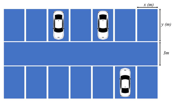 Một bãi đỗ xe được thiết kế như hình vẽ. Bãi đỗ xe gồm 2 dãy, mỗi dãy có 7 chuồng hình chữ nhật với chiều rộng là x m và chiều dài là y m, khoảng cách để làm đường đi giữa hai dãy là 3m. Biết diện tích bãi đỗ xe là 318,5 m2 và chu vi một chuồng đỗ xe là 17 m. Hãy tính chiều dài đường đi.