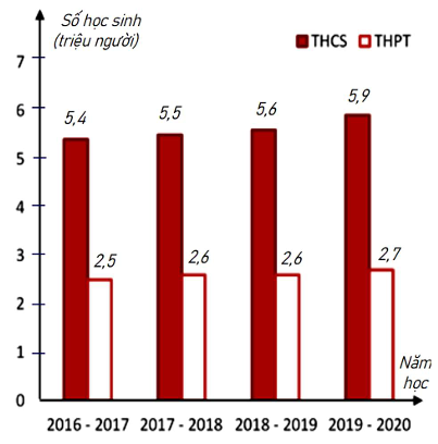 Biểu đồ cột kép biểu diễn số lượng học sinh trung học cơ sở (THCS) và trung học phổ thông (THPT) của Việt Nam trong các năm học 2016 - 2017; 2017 - 2018; 2018 - 2019; 2019 - 2020. (Nguồn: Tổng cục thống kê)
