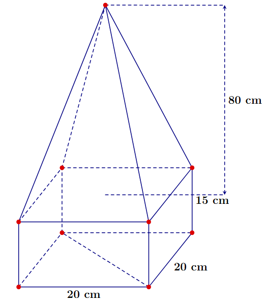 Một khối bê tông có dạng và kích thước như hình bên dưới đây. Phần dưới của khối bê tông có dạng hình hộp chữ nhật, đáy là hình vuông cạnh , chiều cao