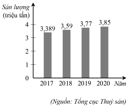 Biểu đồ ở hình bên dưới biểu diễn sản lượng khai thác thủy sản của nước ta trong các năm 2017, 2018, 2019, 2020.