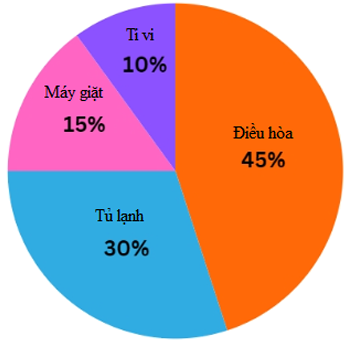 Biểu đồ hình quạt tròn dưới đây biểu diễn tỉ lệ phần trăm các loại điện máy bán được trong tháng 5 ở cửa hàng A. Biết tổng số sản phẩm bán được trong tháng 5 là 60 chiếc.