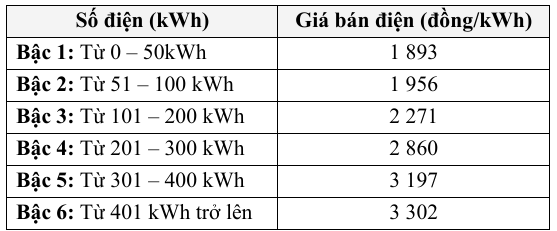 Tiền điện = Số kWh tiêu thụ × giá tiền 1 kWh (theo bậc)