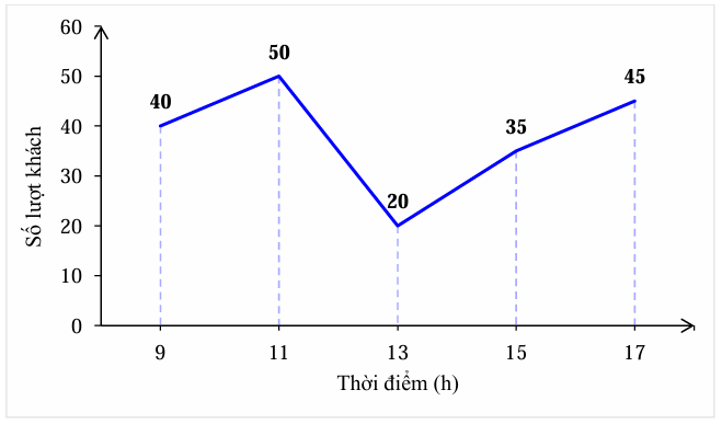 Cho biểu đồ đoạn thẳng dưới đây biểu diễn số lượt khách đã đến ăn Phở Bò tại một nhà hàng vào một số thời điểm trong ngày.