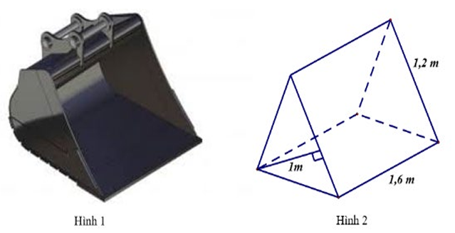 Để xúc cát lên các xe tải, người ta dùng một máy xúc với gàu xúc (Hình 1) có dạng gần như một lăng trụ đứng tam giác kích thước như Hình 2. Nếu coi dung tích của gàu xúc đúng bằng thể tích của hình lăng trụ đứng tam giác thì muốn xúc cát xe phải múc ít nhất bao nhiêu gàu?