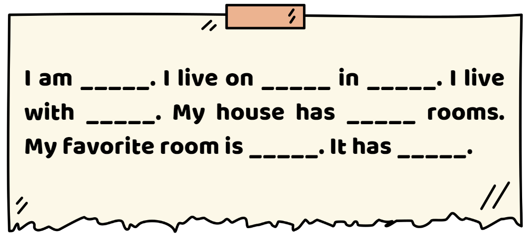 My name is Josh. I live on King Street in New York, the USA. My house has a living room, a kitchen, three bedrooms, and two bathrooms. My favorite room is living room. The living room has a table and a sofa. The table is black. The sofa is pink.