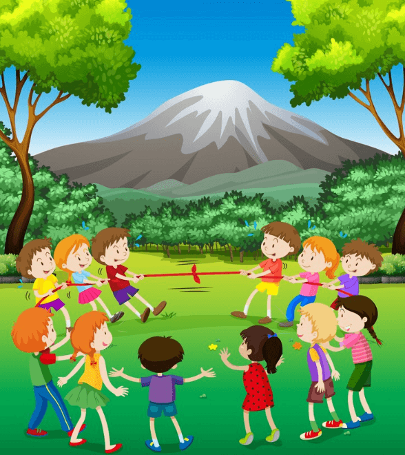 Children in the mountains play simple games. They don't have many toys, but they are creative. A popular game is spinning top. Kids spin tops on the ground and see whose top spins the longest. Another favorite is jumping rope. Children use a long rope and take turns jumping over it. In tug of war, two teams pull on opposite ends of a rope. The team that pulls the other team across a line wins.
