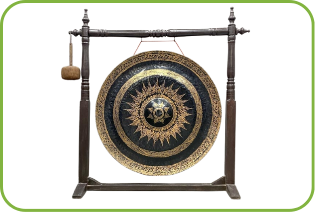 B: It's a large, circular metal disk. When people strike it, it produces a deep sound.