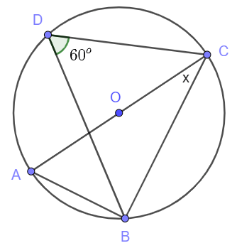 Cho hình vẽ, biết AC là đường kính của (O) và góc BDC bằng 60o.