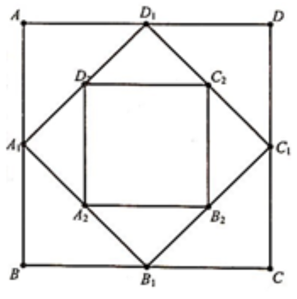 Cho hình vuông ABCD có cạnh bằng 4 và có diện tích S1. Nối 4 trung điểm A1, B1, C1, D1 theo thứ tự của 4 cạnh AB, BC, CD, DA ta được hình vuông thứ hai có diện tích S2. Tiếp tục làm như thế, ta được hình vuông thứ ba là A2B2C2D2 có diện tích S3,…và cứ thế tiếp tục làm như thế, ta tính được các hình vuông lần lượt có diện tích S4, S5, …, S100 (tham khảo hình dưới). Tính tổng S = S1 + S2 + S3 + … + S100.