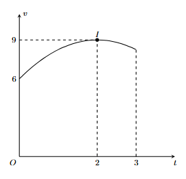 Một vật chuyển động trong 3 giờ với vận tốc (km/h) phụ thuộc vào thời gian (h) có đồ thị là một phần của đường parabol có đỉnh và trục đối xứng song song với trục tung như hình vẽ. Vận tốc tức thời của vật tại thời điểm 2 giờ 30 phút sau khi vật bắt đầu chuyển động gần bằng giá trị nào nhất trong các giá trị sau?