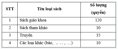 Cho bảng thống kê các loại sách mà lớp 2B đã ủng hộ cho thư viện trường như sau:
