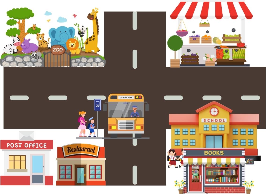 1. The zoo is the market. 2. The post office is the Korean restaurant. 3. The yellow bus is of the bus stop. 4. The secondary school is the bookstore. |