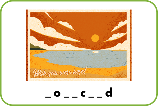 Look at the pictures and find the missing letters. Write the full correct words.