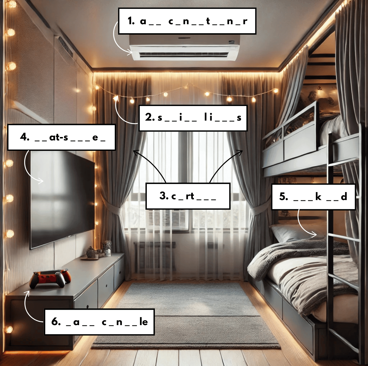 Look at the picture. Find the missing letters and write the correct words in the blanks.