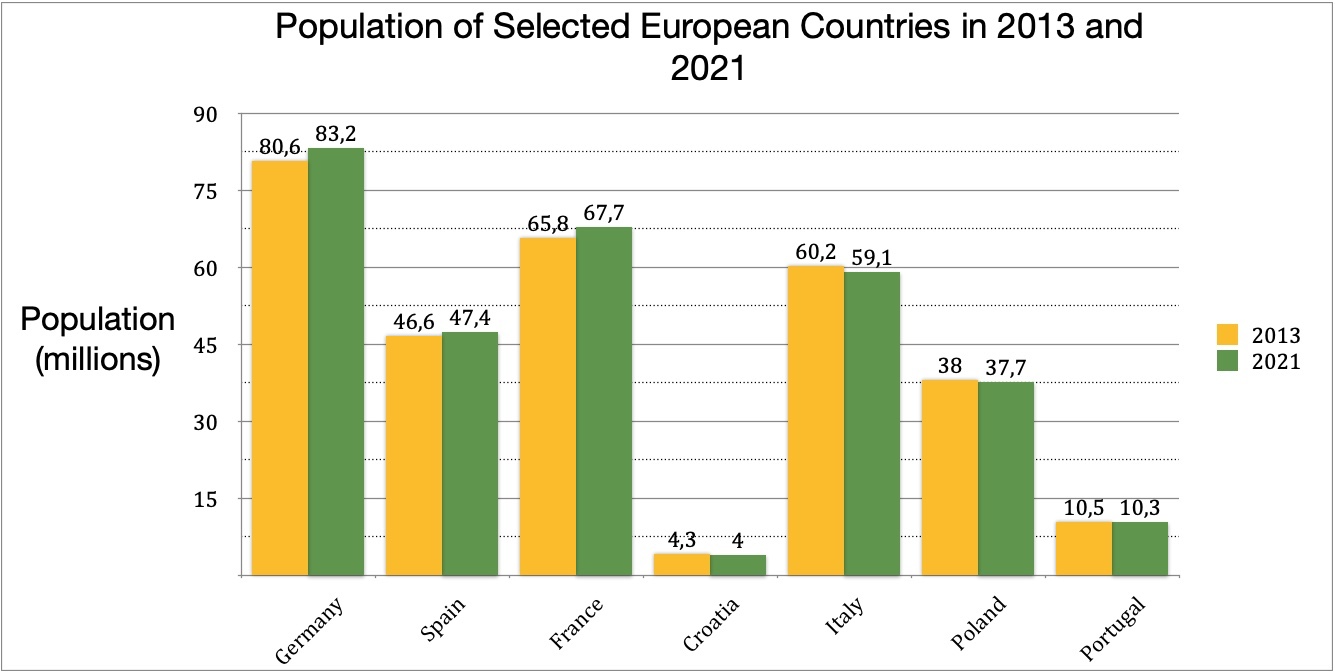 In contrast, several countries experienced population decreases. Italy's population fell from 60.2 million in 2013 to 59.1 million in 2021, a decline of approximately 1.1 million people. Poland saw its population decrease from 38.0 million to 37.7 million. Similarly, Croatia maintained a fairly stable population, going from 4.3 million to 4.0 million, showing a minor decline. Portugal had the smallest population among the countries shown, dropping slightly from 10.5 million in 2013 to 10.3 million in 2021.