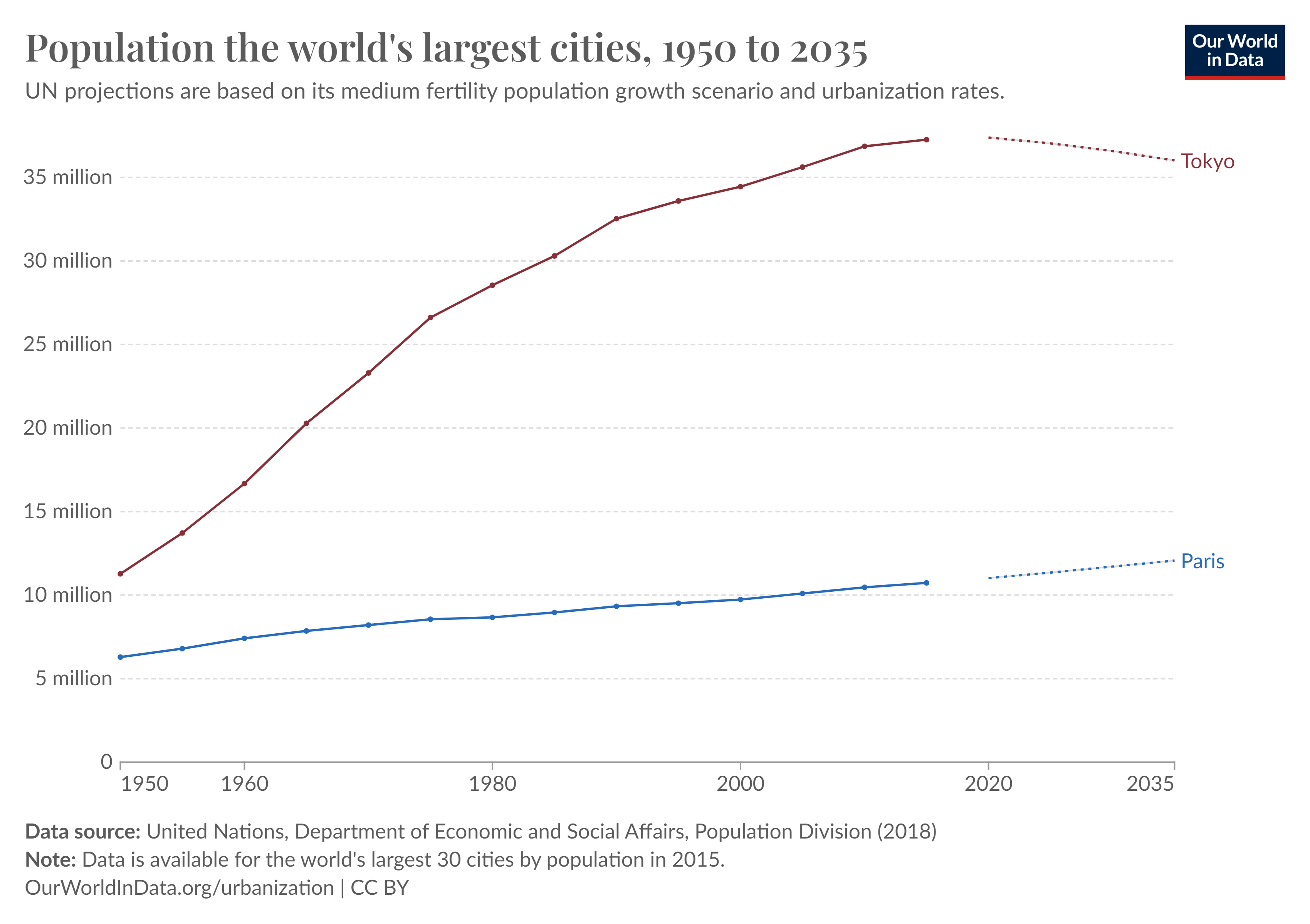 The line graph illustrates population trends in Tokyo and Paris from 1950 to 2035.
