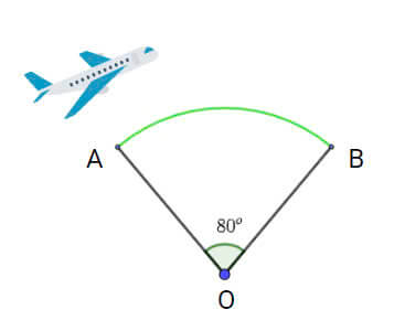 Một máy bay bay đi từ vị trí A đến vị trí B (như hình vẽ) theo cung nhỏ AB. Với A, B nằm trên đường tròn (O; R) (với O là tâm trái đất). Biết góc AOB bằng 80o, bán kính R = OA = 6400 km. Độ dài đường bay của máy bay là bao nhiêu? (Làm tròn kết quả đến hàng đơn vị)