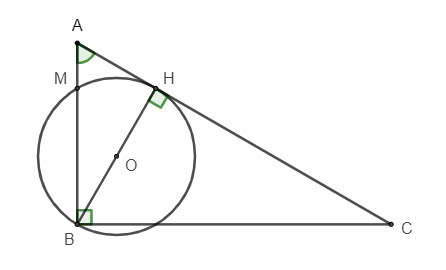 Cho tam giác ABC vuông tại B có AC = 5 cm, góc BAC bằng 60o, đường cao BH. Vẽ đường tròn (O) đường kính BH, đường tròn này cắt BA tại M (M khác B).