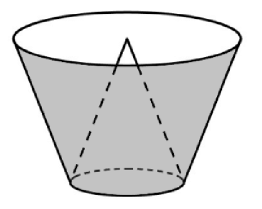 Một cái thùng đựng nước được tạo thành từ việc cắt mặt xung quanh của một hình nón bởi một mặt phẳng vuông góc với trục của hình nón. Miệng thùng là đường tròn có bán kính bằng hai lần bán kính mặt đáy của thùng. Bên trong thùng có một cái phễu dạng hình nón có đáy là đáy của thùng, có đỉnh là tâm của miệng thùng như hình minh họa dưới. Biết đổ 12 lít nước vào thùng thì đầy thùng (nước không chảy vào được bên trong phễu). Tính thể tích của phễu.