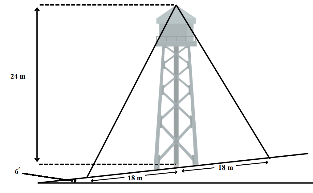Một tháp nước được xây dựng trên một con dốc nghiêng so với phương ngang. Để tháp đứng thẳng, người ta dùng hai dây cáp cố định tháp như hình vẽ. Biết rằng tháp cao 24 m và khoảng cách từ chân tháp đến chỗ cố định dây cáp là 18 m. Hỏi dây cáp dài hơn có chiều dài bằng bao nhiêu (làm tròn kết quả đến hàng phần mười của mét)?