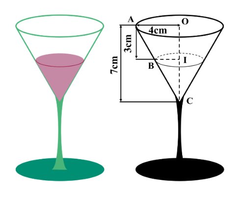 Một cái ly thủy tinh (như hình vẽ), phần phía trên là hình nón có chiều cao 7 cm, có đáy là đường tròn có bán kính 4 cm. Biết trong ly đang chứa nước ép trái cây với mực nước đang cách miệng ly là 3 cm.