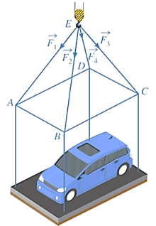 Một chiếc ô tô được đặt trên mặt đáy dưới một khung sắt có dạng hình hộp chữ nhật với đáy trên là hình chữ nhật ABCD, mặt phẳng (ABCD) song song với mặt phẳng nằm ngang. Khung sắt đó được buộc vào móc E của chiếc cần cẩu sao cho các đoạn dây cáp EA, EB, EC, ED có độ dài bằng nhau và cùng tạo với mặt phẳng (ABCD) một góc bằng 60o. Chiếc cần cẩu kéo khung sắt lên theo phương thẳng đứng. Tính trọng lượng của chiếc xe ô tô (làm tròn đến hàng đơn vị), biết rằng các lực căng ,