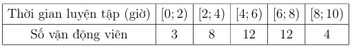 Thời gian luyện tập trong một ngày (tính theo giờ) của một số vận động viên được ghi lại ở bảng sau: