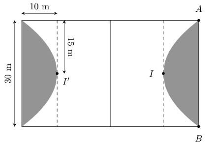 Ông An xây dựng một sân bóng đá mini hình chữ nhật có chiều rộng 30 m và chiều dài 50 m. Để giảm bớt chi phí cho việc trồng cây nhân tạo, ông An chia sân bóng ra làm hai phần (tô đen và không tô đen) như hình bên. Phần tô đen gồm hai miền diện tích bằng nhau và đường cong AIB là một parabol (P) đỉnh I. Phần tô đen được trồng cỏ nhân tạo với giá 130 000 đồng/m2 và phần còn lại được trồng cỏ nhân tạo với giá 90 000 đồng/m2. Hỏi ông An phải trả bao nhiêu tiền để trồng cỏ nhân tạo cho sân bóng?