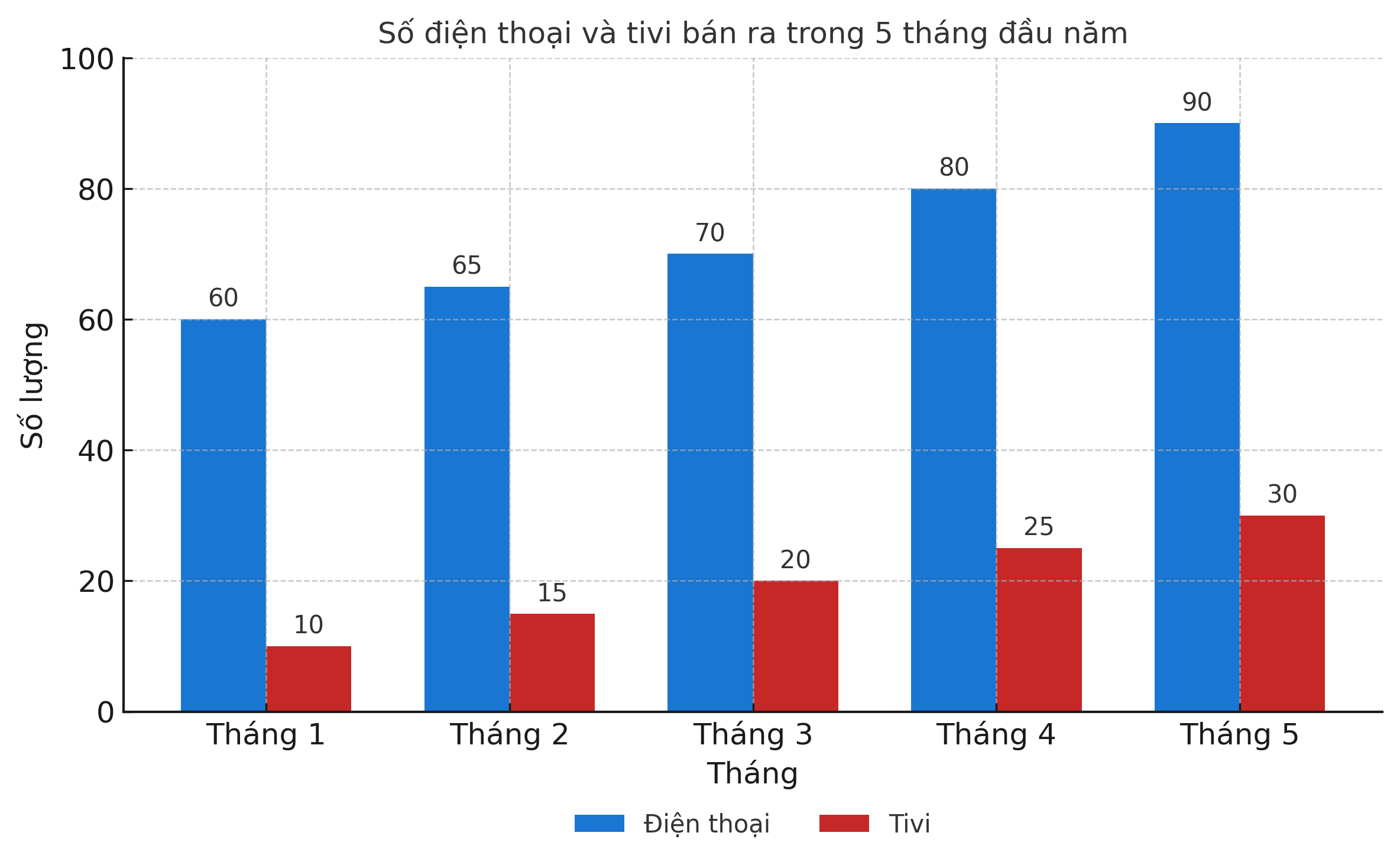 Cho biểu đồ diễn tả số điện thoại và tivi của một cửa hàng bán được trong 5 tháng đầu năm: