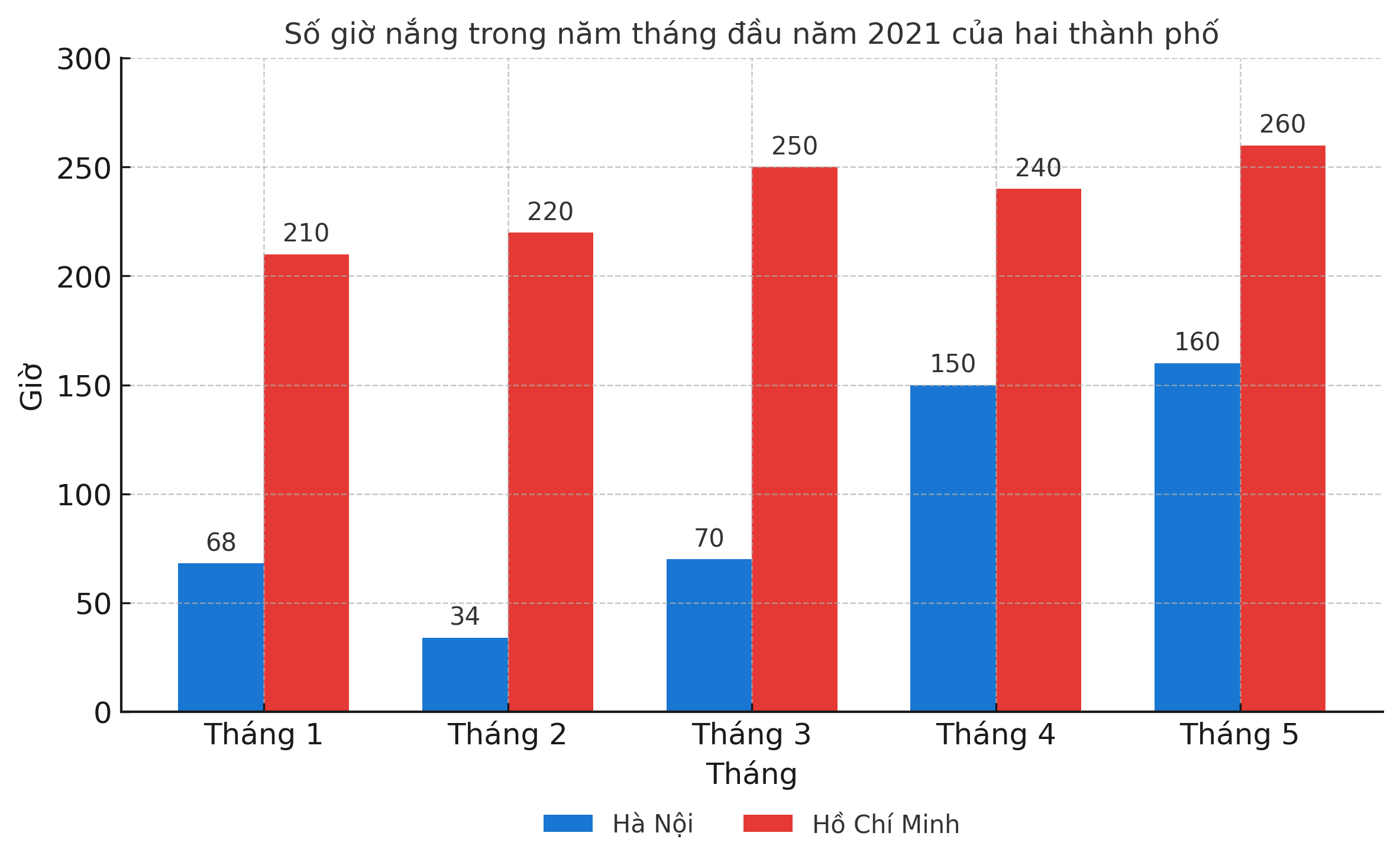 Biểu đồ cột kép biểu diễn số giờ nắng trong năm tháng đầu năm 2021 của thành phố Hà Nội và thành phố Hồ Chí Minh: