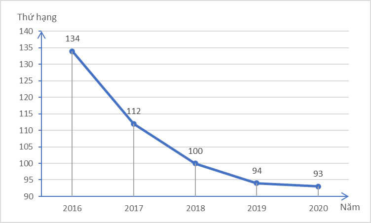Biểu đồ dưới đây cho biết thứ hạng của đội tuyển bóng đá Việt Nam trên bảng xếp hạng liên đoàn Bóng đá thế giới (FIFA) trong các năm từ 2016 đến 2020.