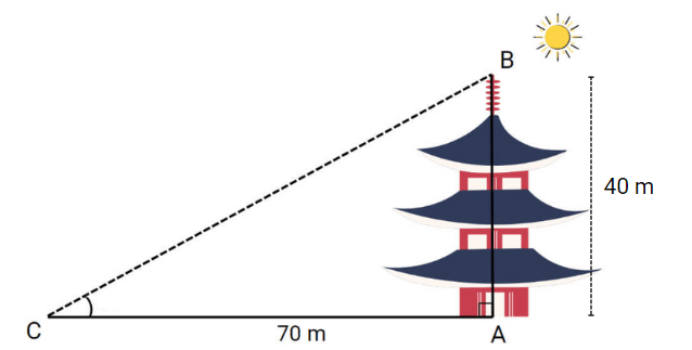 Một ngọn tháp cao 40 m và bóng ngọn tháp trên mặt đất dài 70 m như hình minh họa bên dưới. Góc tạo bởi tia nắng mặt trời với mặt đất gần nhất với giá trị nào dưới đây?