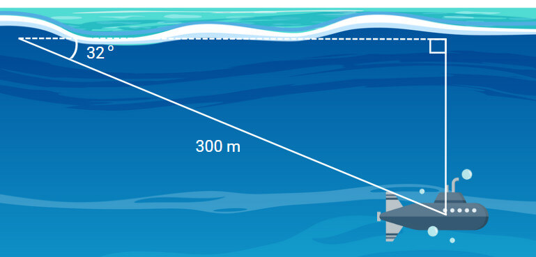 Tàu ngầm đang ở trên mặt biển bỗng đột ngột lặn xuống theo phương tạo với mặt nước biển một góc 32o. Nếu tàu chuyển động theo phương lặn xuống được 300 m thì nó ở độ sâu bao nhiêu mét? (Kết quả làm tròn đến hàng đơn vị)