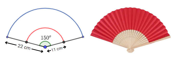 Khi căng một chiếc quạt giấy ta được một hình quạt với kích thước như hình vẽ minh họa dưới. Hãy tính diện tích phần giấy để làm một cái quạt biết quạt chỉ cần dán một mặt giấy. (Kết quả làm tròn đến hàng đơn vị)