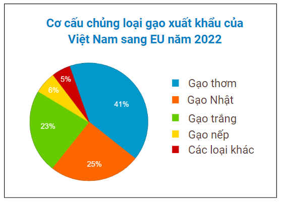 Năm 2022, Việt Nam đã xuất khẩu 94510 tấn gạo sang thị trường Liên minh Châu Âu (EU). Biểu đồ dưới đây biểu diễn cơ cấu xuất khẩu mỗi loại gạo theo tỷ lệ phần trăm từng loại (tính theo số phần trăm):