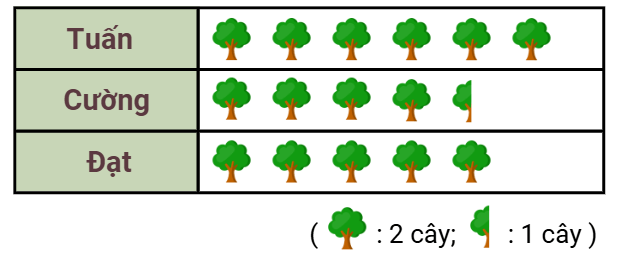 Số lượng cây mà 3 bạn Tuấn, Cường, Đạt đã trồng được vào ngày hội trồng cây được biểu diễn ở biểu đồ tranh dưới đây.