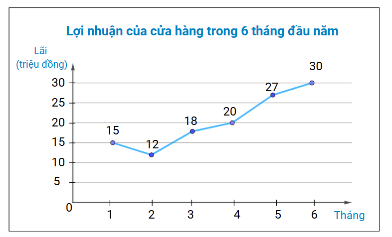 Cho biểu đồ đoạn thẳng biểu diễn lợi nhuận của 1 cửa hàng trong 6 tháng đầu năm.