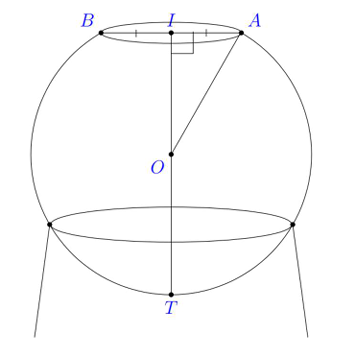 Một hồ cá có hình dạng là một phần của hình cầu tâm . Hồ cá được đặt trên một giá đỡ như hình vẽ. Người ta đo được đường kính của miệng hồ là