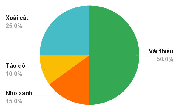 Biểu đồ ở hình dưới cho biết tỉ lệ khối lượng các loại quả bán được trong ngày Chủ nhật của một cửa hàng. Biết khối lượng Nho xanh bán được là 24 kg. Khối lượng Vải thiều bán được là bao nhiêu?