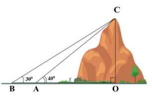 (như hình vẽ). Biết khoảng cách giữa hai địa điểm A, B là 600 m. Tính chiều cao của ngọn núi? (Kết quả tính theo đơn vị mét và làm tròn đến chữ số hàng đơn vị).