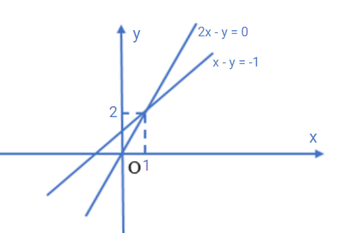 Biểu diễn miền nghiệm của hai phương trình x - y = 0 và x + y = 2 trên cùng một mặt phẳng tọa độ Oxy như hình vẽ: