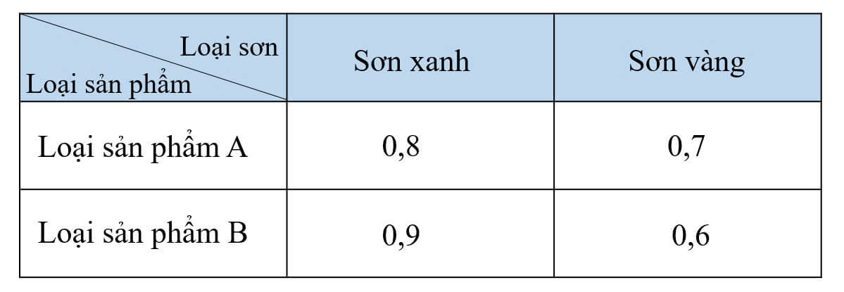 Người ta cần sơn hai loại sản phẩm A và B bằng hai loại sơn: Sơn xanh, sơn vàng. Lượng sơn để sơn mỗi loại sản phẩm đó được cho ở bảng dưới (Đơn vị: kg/1 sản phẩm)